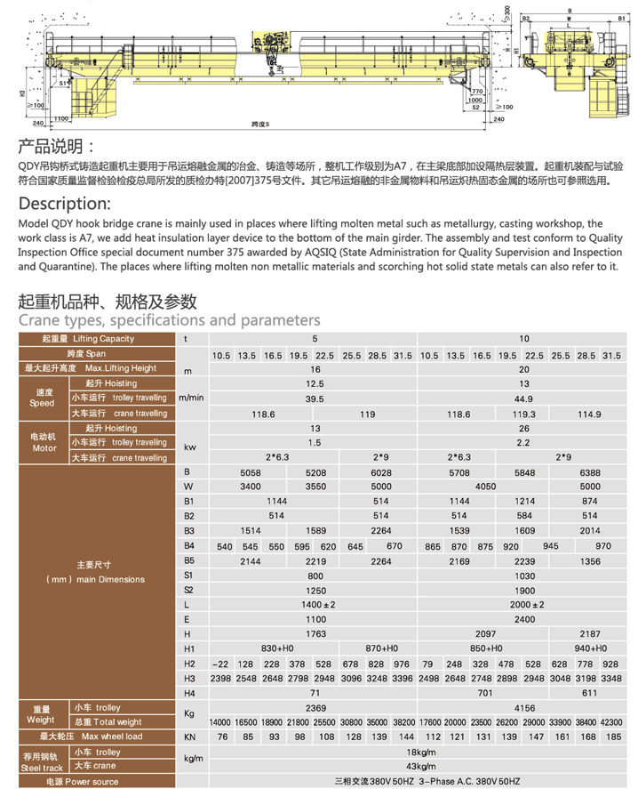 QDY吊鉤橋式鑄造起重機(jī)主要用于吊運(yùn)熔融金屬的冶金、鑄造等場所,整機(jī)工作級別為A7,在主梁底部加設(shè)隔熱層裝置。起重機(jī)裝配與試驗符合國家質(zhì)量監(jiān)督檢驗檢疫總局所發(fā)的質(zhì)檢辦特[2007]375號文件。其它吊運(yùn)熔融的非金屬物料和吊運(yùn)熾熱固態(tài)金屬的場所也可參照選用。